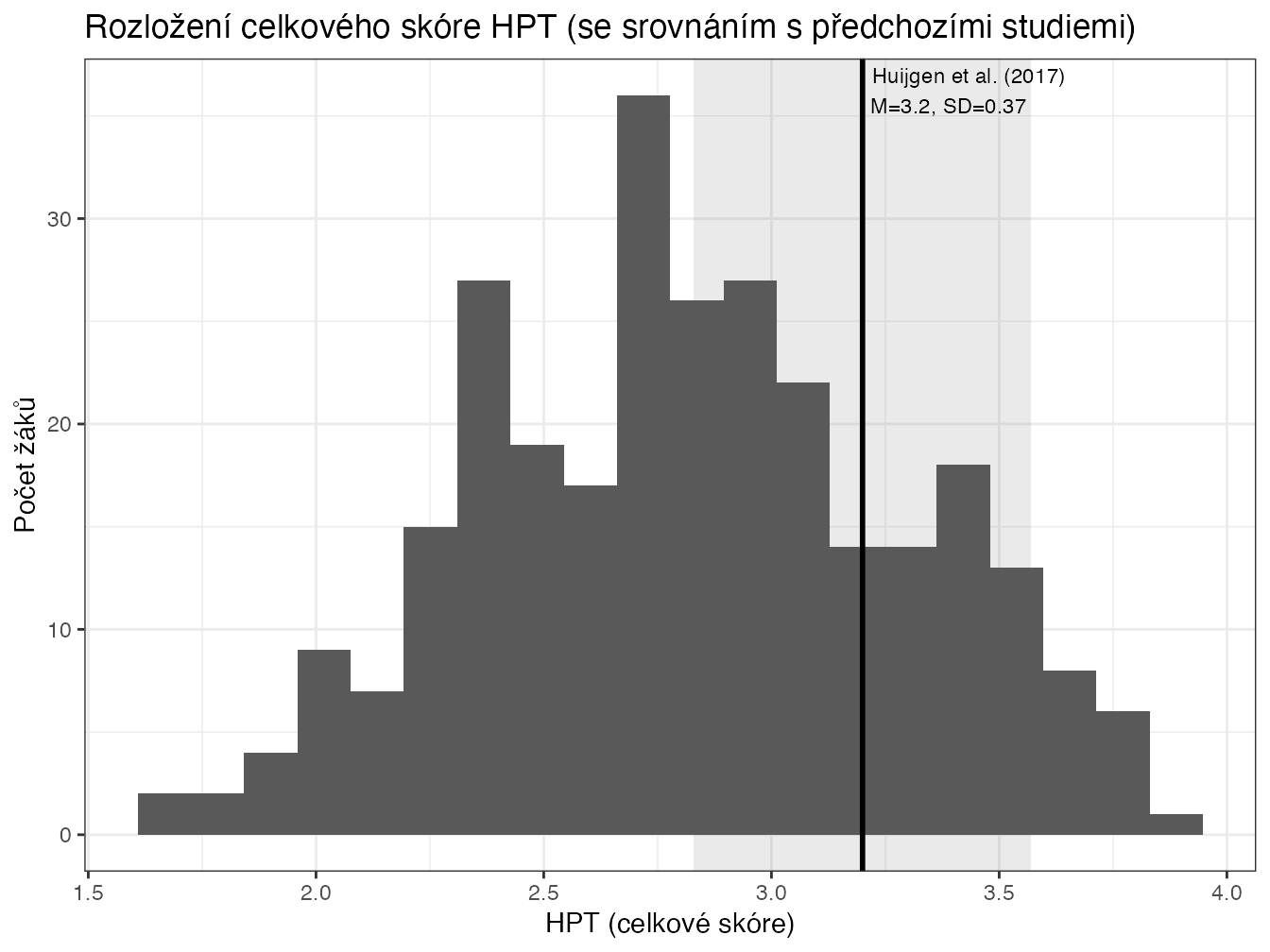 Rozložení výsledků HPT zhruba odpovídá normálnímu rozložení, které se dalo očekávat. Celkově žáci dosahovali o něco nižších výsledků než v původní studii (Huijgen et al., 2016), ale rozdíl nebyl velký. Vliv na to mělo i to, že na rozdíl od nizozemské studie se výzkumu zúčastnili i žáci 9. ročníků ZŠ, učilišť a středních odborných škol. V nizozemskě studii šlo pouze o žáky z ekvivalentu gymnázií.