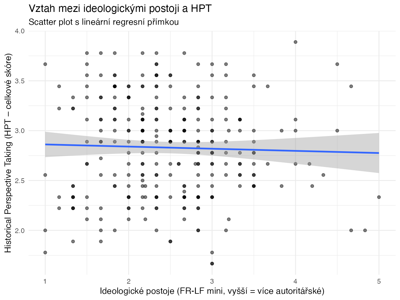 Ne, předpoklad, že žáci s autoritářskými postoji dosáhnou lepších výsledků v HPT testu, se nepotvrdil. Korelace mezi postoji a výsledky v HPT byla velmi slabá až nulová. To znamená, že výsledky v HPT testu nejsou kontaminovány současnými postoji žáků. Dobrá zpráva pro učitele dějepisu - výsledky v HPT testu skutečně odrážejí schopnost žáků zaujmout dobové perspektivy, nikoliv jejich současné názory. Můžete ho tedy bez obav používat jako nástroj pro diagnostiku historického myšlení vašich žáků.